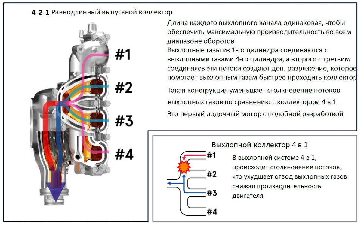 2. Равнодлинный выхлопной коллектор системы 4-2-1 максимизирует крутящий момент и ускорение. Эта уникальная разработка первая в отрасли и ее можно найти только на подвесных моторах Tohatsu.